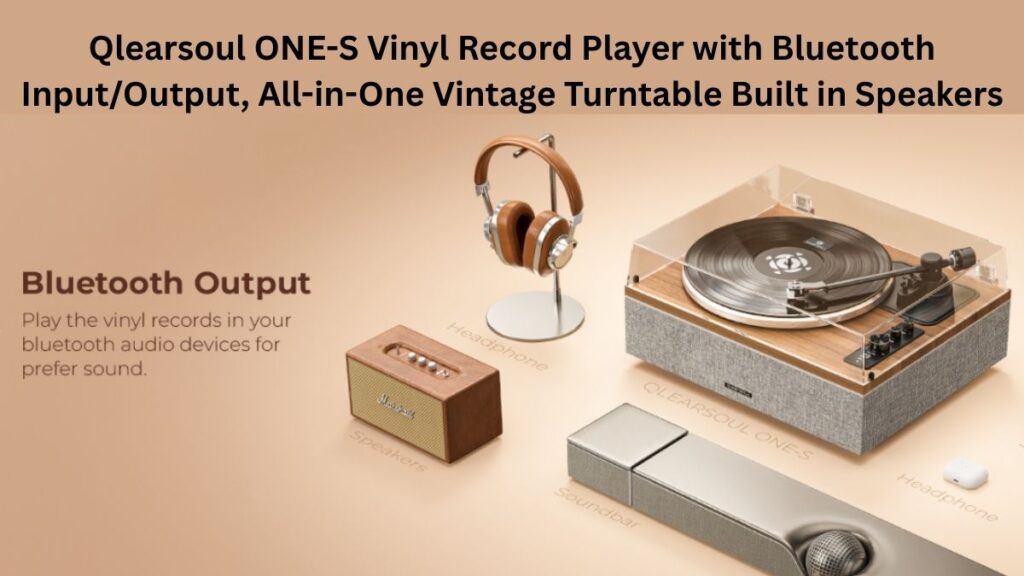 Qlearsoul ONE-S Vinyl Record Player with Bluetooth Input/Output, All-in-One Vintage Turntable Built in Speakers, Phono Preamp & DSP, AT-3600L Cartridge, 3345 RPM