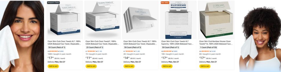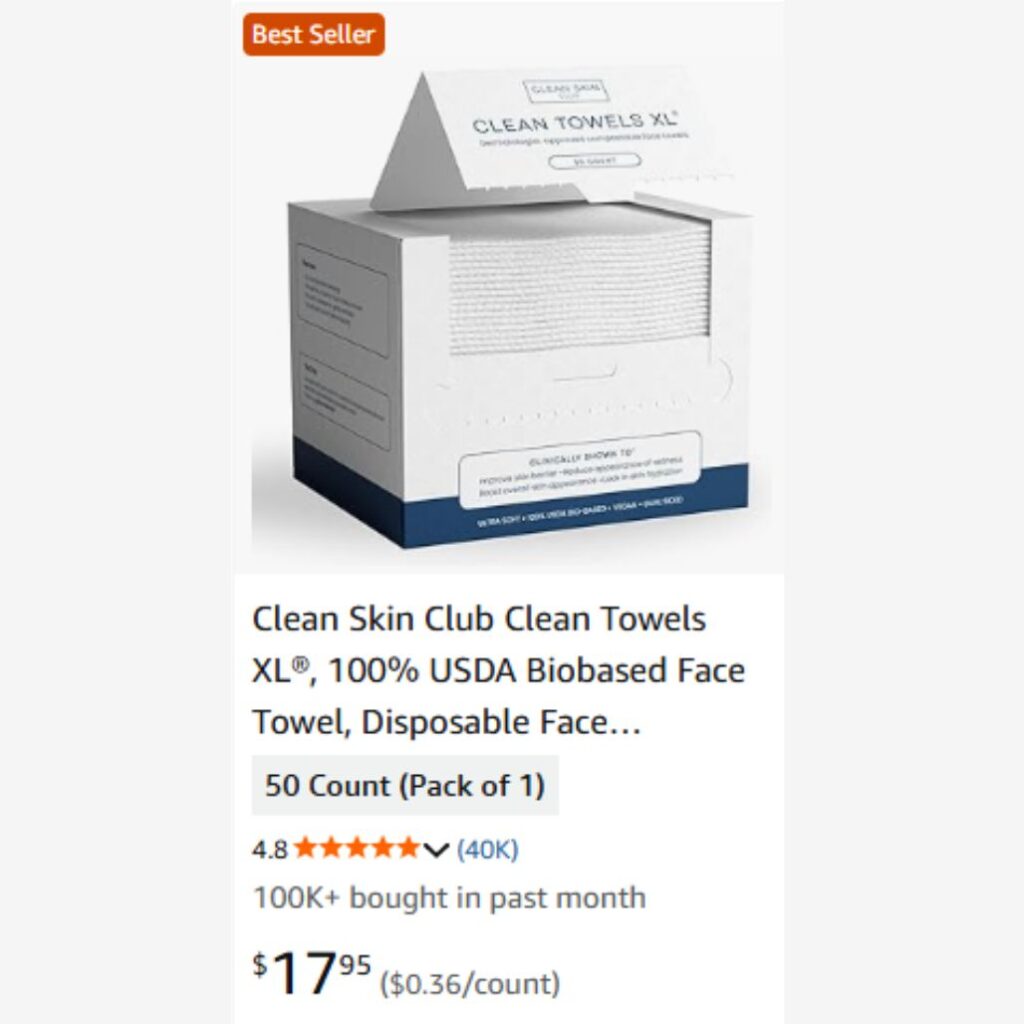 Discover the ultimate in skincare hygiene with Clean Skin Club Clean Towels XL®, the original 100% USDA Certified Biobased disposable face towels. Each pack includes 50 ultra-soft, dermatologist-tested dry facial towels designed to replace traditional washcloths that can trap dirt and bacteria.