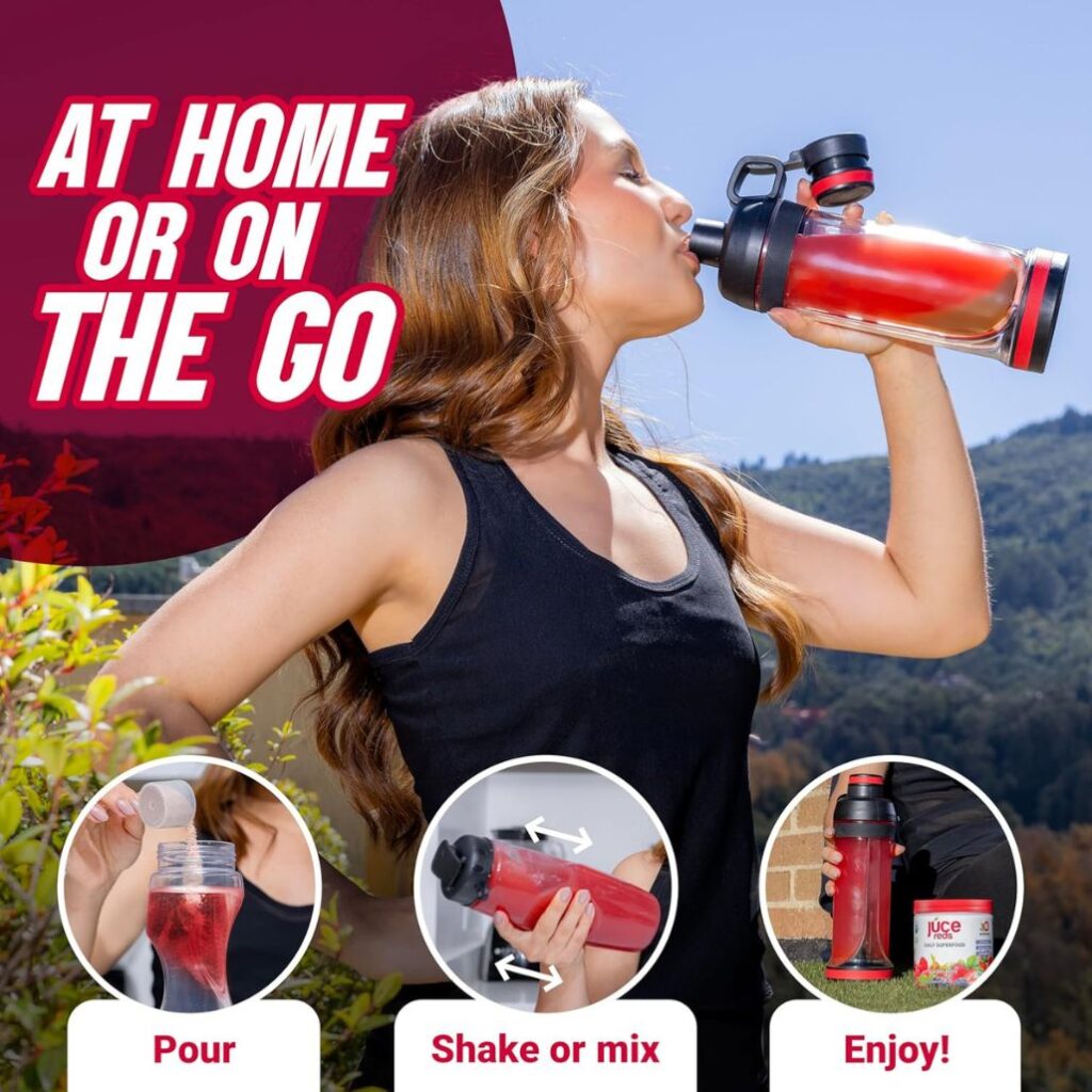 A: Mix one scoop of JUCE Reds with water, juice, or a smoothie. Stir well or use a shaker bottle for best results. It’s perfect for a quick, nutritious boost at home, work, or on the go.