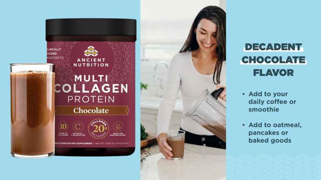 EASY TO USE & NUTRIENT-RICH – Two scoops of Ancient Nutrition Multi Collagen Protein Powder in our rich chocolate flavor provide 20g of collagen, 18g of protein, 200% of your daily Vitamin C, and 4 billion CFU* probiotics (*at time of manufacture). Simply mix 2 scoops into your favorite smoothie, shake, coffee, tea, or beverage for a daily boost in collagen and joint support.